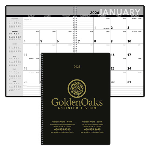 • Planner features one month on each two-page spread, along with six months on left column and ample space for notes