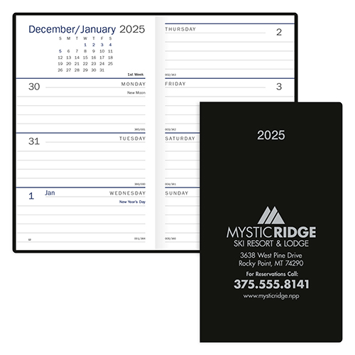 This custom pocket planner is designed for on-the-go productivity. With a week-at-a-glance layout on a two-page spread, it keeps your recipients on track without overwhelming them. Meanwhile, a fine foil-stamped imprint puts your logo front and center, day after day.