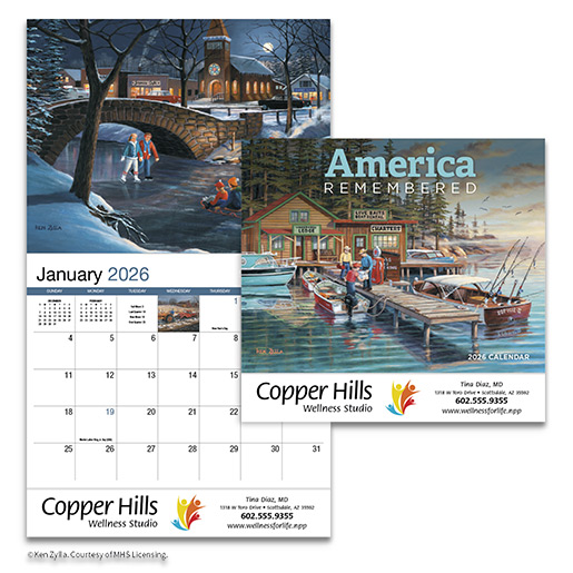 Bring warmth, nostalgia, and American charm to your brand promotions with the America Remembered Appointment Calendar. Each month features beautifully illustrated scenes of small-town life, painted with heart and heritage. It’s more than a calendar, it’s a keepsake your clients will appreciate all year long.