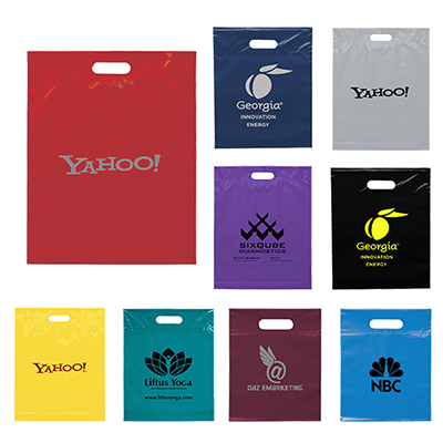 These custom die cut handle bags are the go-to choice for retail stores, trade shows, and promotional giveaways. Crafted from low-density 2.5 mil plastic, these printed plastic bags feature reinforced die cut handles and a 3" gusset for added capacity. Proudly Made in the USA and FDA-approved, they're perfect for carrying everything from marketing materials to merchandise - while keeping your logo front and center.