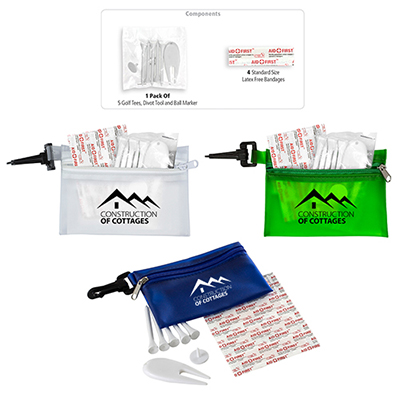 • Zippered pouch contains 1 Golf Divot Tool, 5 Golf Tees, 1 Ball Markers and 4 Standard Latex Free Bandages