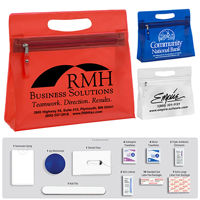 • Contains: 10 Standard Size Latex Free Bandages, 1 Extra Large Latex Free Bandage, 2 Skin Lotions, 2 Triple Antibiotic Ointments, 4 Moist Towelettes, 4 Antiseptic Towelettes, 1 White Sunscreen Credit Card Shape Spray, 1 Matching Color Lip Moisturizer, 1 White Case Dental Floss, 1 Nail File and 1 First Aid Guide