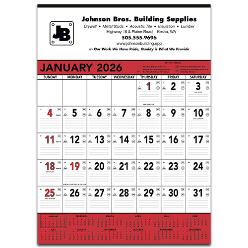 The Red & Black Memo Business Wall Calendar 2026 is a professional favorite among contractors, offices, and commercial industries. This 13-sheet memo-style calendar features bold red-and-black grids, Julian dates, and workdays remaining, helping businesses stay on track while showcasing your logo every day. A December top sheet is also included at no extra cost, making this one of the most practical business wall calendars for year-round visibility.