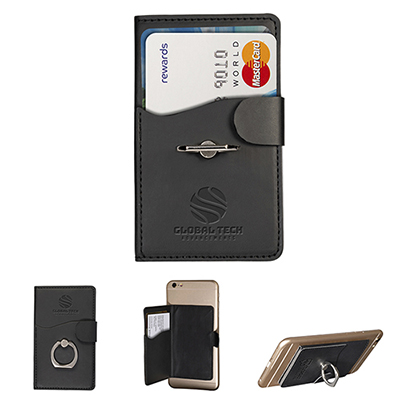 • PU Leatherette duo smartphone pocket with rotating metal ring on back that transforms device into stand