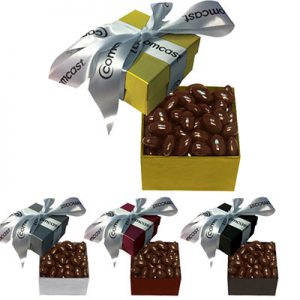 This Classic Gift Box is filled with chocolate-coated almonds. This product comes in an elegant gift box and is made in the USA. Get your logo stamped on the ribbon or box. This crunchy product leaves behind a taste that lingers for a long time!