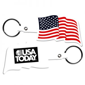 This key tag is made in the USA. It features flex-soft touch material and has a 1″ split-ring attachment. Coming with blue and red flag stock art, this product is individually packed for easy distribution. This inexpensive key tag is a hit among our buyers!