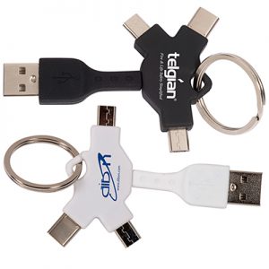 Here is a unique key chain for your next marketing campaign. It features a USB 2.0 cable and 3 charging cables – 2 Micro USB connectors and 1 USB C connector. Made of ABS Plastic, this product features iron and TPE components. All 3 cables can be used simultaneously.