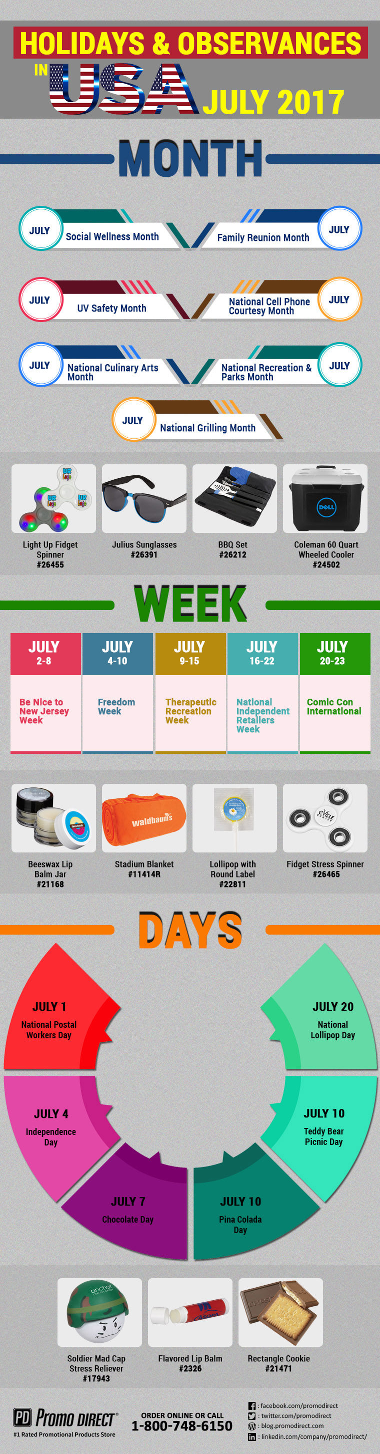 July is all about enjoying the warm weather, beaches and great outdoors! And with it comes a host of holidays and observances that serve as perfect opportunities for brands to celebrate, raise awareness and give back! The infographic below highlights important observances coming up in July. Use it to plan your marketing initiatives and make your campaigns a great success!