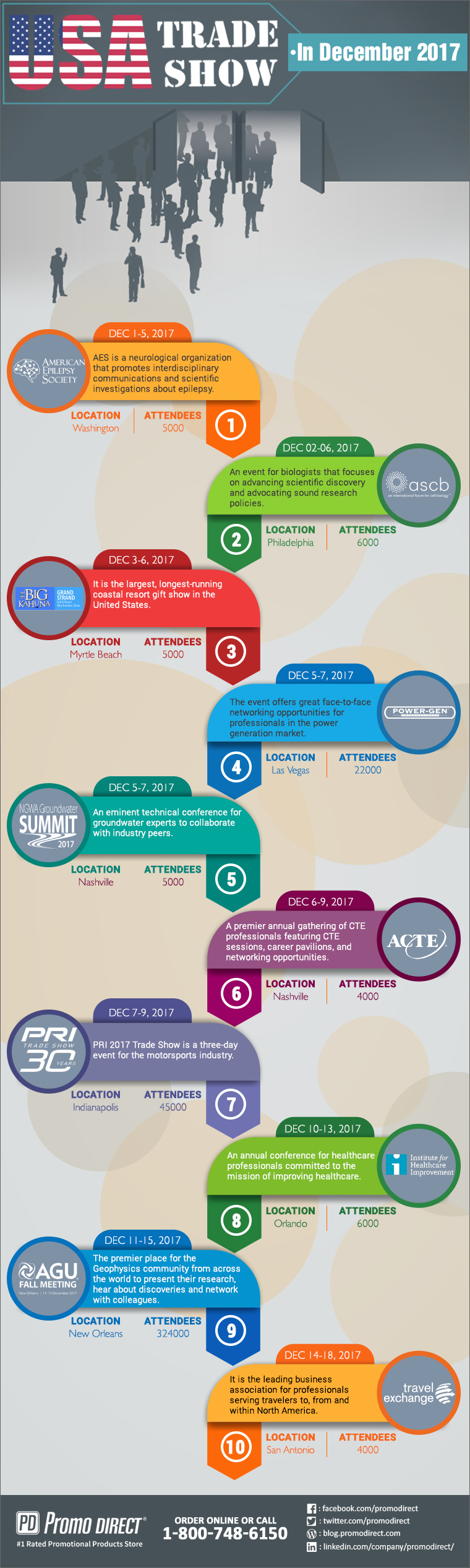 The following infographic lists trade shows taking place in the US in December 2017. Consider exhibiting at a trade show that’s specific to your industry and uncover new business opportunities!