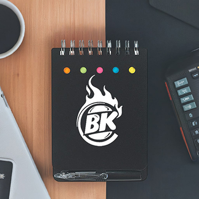 The customized Spiral Jotter with Sticky Notes, Flags & Pen is a handy organizer at work desks